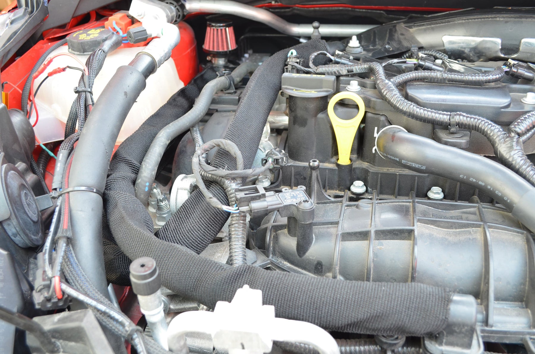 The DM Fiesta ST OCC kit connects into the intake manifold/valve cover PCV connection. Most oily blow-by contaminates travel this path from boost into vacuum transitions, where crankcase pressure has the potential to be greater, then the system immediately turns to a slight vacuum. This causes a fine oily mist that would otherwise flow into the intake manifold. With the DM OCC kit in place, the hoses route the blow-by to the OCC, where they can be filtered and cleaner air is sent back into the manifold. In turn the primary benefits are: cleaner air mixture, and less oily build-up on the valves and in the intake manifold.